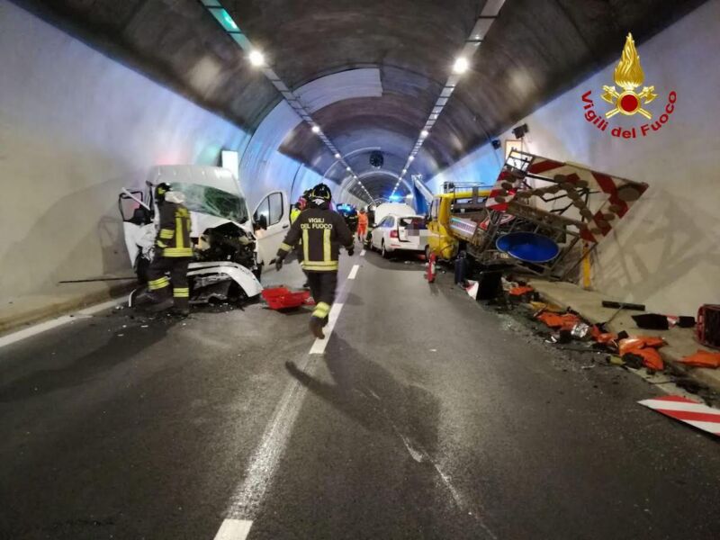 Nello scontro rimanevano coinvolti una piattaforma area ed un furgone che svolgevano lavori all’interno della galleria, un furgone ed una autovettura.