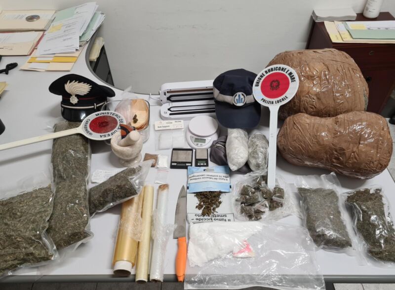 Arrestati un cesenate di 33 anni e 19enne rumeno, domiciliati a Gatteo per detenzione ai fini di spaccio di sostanze stupefacenti. I due sono stati bloccati nella nottata di mercoledi’ dai Carabinieri di Gambettola, e dal personale della Polizia municipale dell’Unione Rubicone e Mare. Gli uomini delle forze dell’ordine avevano notato la sera precedente i due nelle pertinenze di una casa abbandonata situata sempre nel comune di Gatteo. pertanto, congiuntamente, decidevano di appostarsi al fine di monitorarne i movimenti ed eventualmente procedere al loro controllo. Nel corso del servizio, quindi, veniva notato il 19enne il quale, dopo essere entrato all’interno dell’abitazione, ne usciva imbracciando un badile, con il quale iniziava a scavare una buca, terminata la quale se ne andava. Successivamente, dopo qualche ora, giungeva sul posto il 33enne italiano, il quale, entrato nell’abitazione abbandonata, ne usciva imbracciando un borsone di colore rosso e si avviava verso la buca precedentemente preparata dal complice. Notato ciò, i militari ed il personale della Polizia Locale decidevano di procedere al controllo dello stesso, rinvenendo all’interno del borsone rosso che lo stesso stava trasportando, quasi 4 kilogrammi di sostanza stupefacente del tipo marijuana suddivisa in nove involucri, nonche’ della sostanza da taglio. constatato ciò, quindi, gli operanti decidevano di procedere alla perquisizione locale dell’abitazione del ragazzo, all’interno della quale trovavano anche il 19enne precedentemente notato a scavare la buca. All’esito di tale accertamento, venivano rinvenuti nella disponibilità dei due, ulteriori 910 grammi complessivi di marijuana e gammi 6,99 di sostanza stupefacente del tipo cocaina, nonche’ materiale vario (bilancini di precisione, cellophane, macchine termosaldatrici, ecc.) necessario per il taglio, la pesatura ed il confezionamento dello stupefacente.
