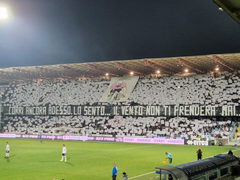 BRIVIDI – Dopo la gara a porte chiuse con la Fermana, il Manuzzi, torna a rianimarsi. A trasudare storia, tifo e passione da ogni poro. La curva bianconera è (quasi) piena come ai bei tempi: la coreografia allestita prima del match per onorare il 20esimo anniversario della morte di Marco Pantani (che cade proprio domani, 14 febbraio) è da brividi. Nutrita anche la rappresentanza aretina salita in Romagna (circa 600 tifosi). In campo, nei primi diciotto minuti, non succede assolutamente nulla. I padroni di casa (che in attacco, al fianco di Corazza, presentano inizialmente Ogunseye e non Shpendi) sono ben controllati dalla truppa guidata dal vecchio Indiani. Poi, all’improvviso, la gara si incendia. Prima, il signor Vergato di Bari, non assegna un rigore solare ai bianconeri (Ogunseye buttato giù in area). Poi, un innocuo cross dalla destra scagliato verso l’area avversaria da Berti, viene deviato nella propria porta dallo sfortunatissimo Chiosa. L’Arezzo prova a reagire, senza troppa convinzione: al 28’ Gaddini fa comunque vedere i sorci verdi a Pisseri. Partita bruttina, si vive di fiammate improvvise. Quasi sempre griffate Donnarumma ed Ekuban. Si arriva stancamente all’intervallo senza altri sussulti degni di nota.