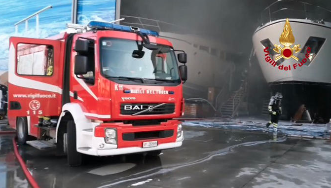 Da circa le 9.40 di questa mattina, 5 squadre dei vigili del fuoco sono al lavoro per domare le fiamme che hanno avvolto uno yacht di 30 metri, dal valore di mercato di qualche milione, quasi completato e pronto per la consegna.