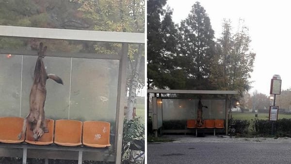 Raccapricciante scena quella che si è presentata davanti agli occhi di quanti ieri mattina alle 7 a Ospedaletto, frazione di Coriano, si sono portati alla fermata del bus in via Montescudo: un lupo grigio con il cranio fracassato era appeso per le gambe posteriori alla pensillina.