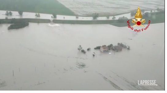 Allerta rossa per il maltempo in Emilia Romagna. Sono esondati diversi corsi d’acqua nel Ravennate. Nelle immagini diffuse dai vigili del fuoco la piena del torrente Sillaro e il sorvolo del territorio tra Massa Lombarda e Conselice. Sono 400 gli interventi dei vigili del fuoco per il maltempo in Emilia Romagna. Allagamenti a Faenza per la rottura degli argini del fiume Lamone, con evacuazione di alcune abitazioni. Abitazioni evacuate precauzionalmente anche a Dovadola (FC) per una frana, a Monzuno e Castel San Pietro (BO) per allagamenti. Inviate in rinforzo sezioni operative vigili del fuoco da Veneto e Lombardia, mezzi anfibi da Lombardia e mezzi movimento terra dalla Toscana. Video al link: https://www.lapresse.it/cronaca/2023/05/03/maltempo-esondano-corsi-dacqua-nel-ravennate/