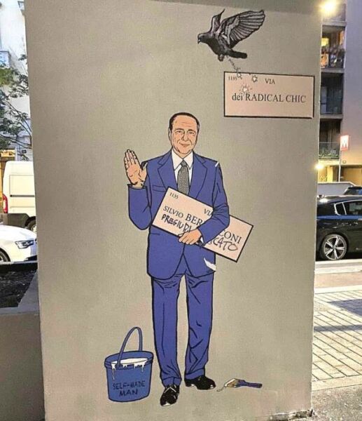 Vandalizzato in appena 48 ore anche il terzo murales che ritrae Silvio Berlusconi, “pregiudicato” è la grande scritta che appare questa mattina sulla targa toponomastica che il Cavaliere ha sottobraccio nell’ultima opera realizzata dall’artista aleXsandro Palombo apparsa ad un mese esatto dalla scomparsa del Cavaliere. L’opera di Palombo è un monito alla riflessione che sorvola divisioni e ideologie politiche, l’artista pone la sua attenzione sull’uomo e le sue contraddizioni ma lo fà con uno spirito di pacificazione che si concentra sul Berlusconi comunicatore, l’uomo che ha inciso profondamente sulla cultura popolare italiana degli ultimi 40 anni.