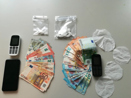 La perquisizione personale e quella locale eseguite a carico dello spacciatore hanno permesso di sequestrare, complessivamente, 6 dosi di cocaina, materiale per il confezionamento della droga, tre telefoni cellulari e oltre mille euro in contanti.
