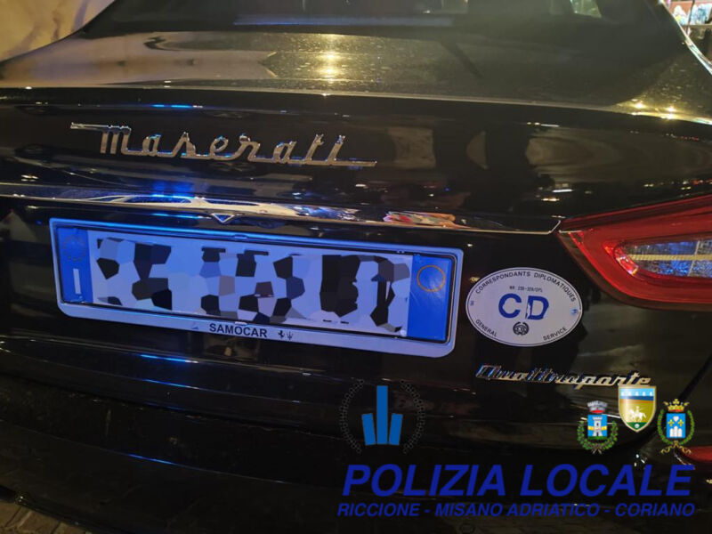 Durante i controlli effettuati in ore serali lungo la via Dante a Riccione veniva intimato l’alt ad una potente autovettura Maserati, con targa italiana, ma con affisse placchette di appartenenza al corpo diplomatico.