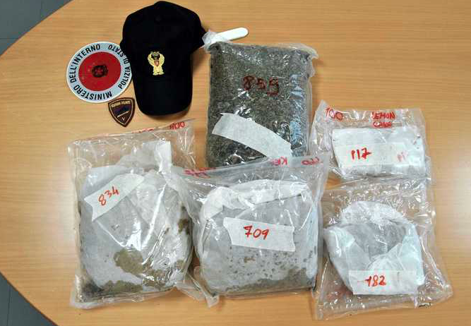 Dopo aver perlustrato la zona per verificare la presenza di tracce utili, riconducibili all’eventuale possessore della sacca i Poliziotti hanno appurato come al suo interno ci fossero 4 involucri contenenti hashish e uno contenente marijuana per un peso complessivo, rispettivamente, di 1840 grammi e 859 grammi.