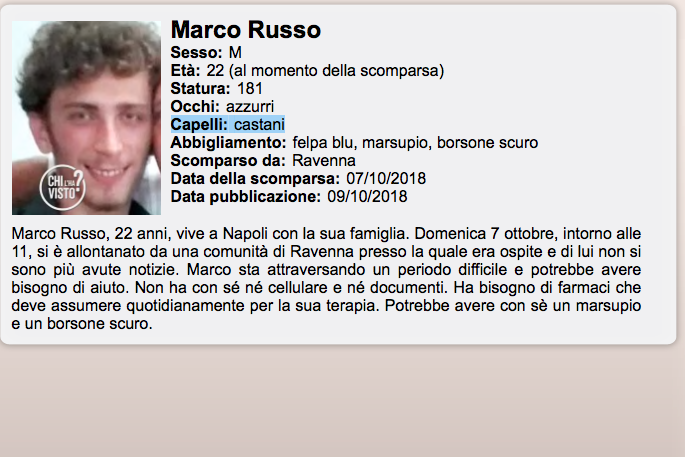 Marco Russo, 22 anni, di origine napoletana domenica 7 ottobre, intorno alle 11, si è allontanato da una comunità di Ravenna presso la quale era ospite e di lui non si sono più avute notizie.