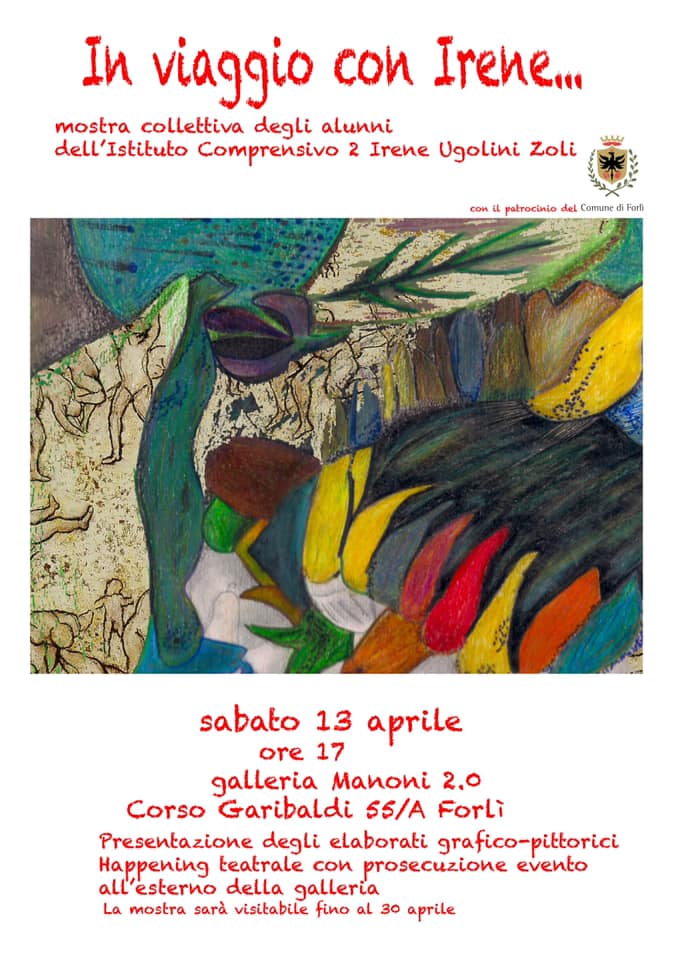 Irene Ugolini Zoli interpretato e rielaborato dagli studenti delle scuole materne primarie e secondarie. Sabato 13 aprile alle 17, inaugura, infatti, dello spazio Manoni 2.0 Belle Arti, in Corso Garibaldi 55/A a Forlì della Mostra collettiva degli alunni dell’Istituto Comprensivo 2 Irene Ugolini Zoli dal titolo: IN VIAGGIO CON IRENE. Presentazione degli elaborati grafico-pittorici. Happening teatrale con prosecuzione evento all’esterno della Galleria. La Mostra sarà visitabile fino al 30 Aprile.