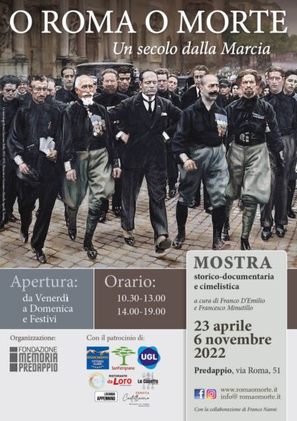 Sabato 23 aprile 2022, alle ore 11.00, a Predappio in via Roma n. 51 inaugurazione della mostra storico-documentaria O ROMA O MORTE. Un secolo dalla marcia, evento culturale che ricostruisce le ragioni, gli antefatti, lo svolgimento di un avvenimento che tanto ha segnato la storia del ‘900 italiano.