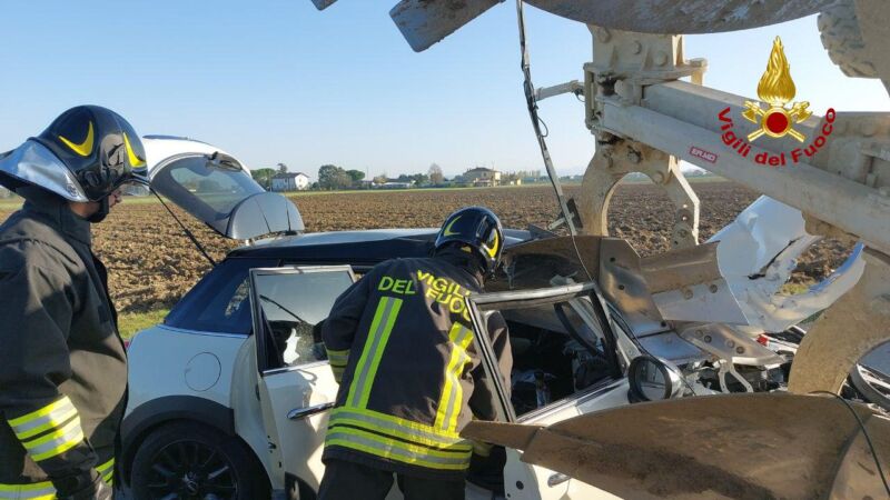 Scontro tra un’auto e un mezzo agricolo. La macchina ha colpito le lame dell’aratro nel retro del trattore. Una persona è rimasta ferita. E’ successo alle 15.43 di oggi, sabato 29 ottobre in via Bagalona nel comune di Bertinoro. Sul posto una squadra del Comando Vigili del Fuoco di Forlì.