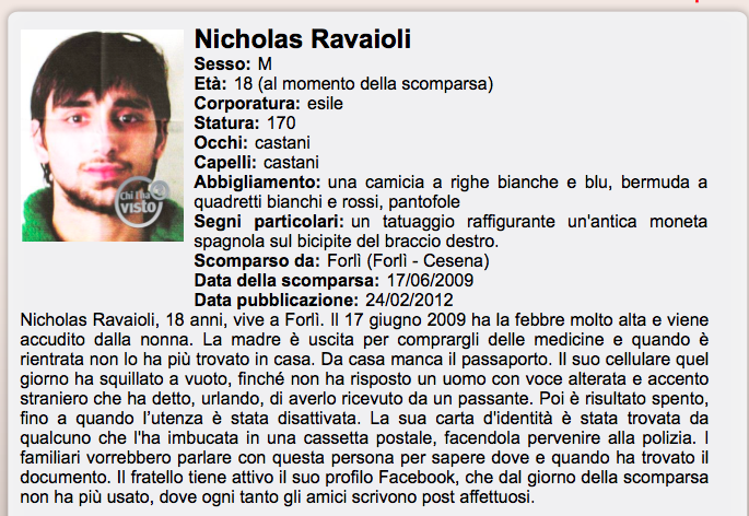 Cosa è successo a Nicholas Ravaioli? Il 18enne è scomparso da #Forlì il 17 giugno 2009. La trasmissione Chi L’ha Visto? si è occupata anche questa sera mercoledì 10 novembre della scomparsa del giovane forlivese che la mamma, Anna Appi, non ha mai smesso di cercarlo.