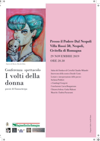 Da quel 25 dicembre del 1977, anno della sua scomparsa, sono trascorsi oltre 40 anni, ma il mito della poesia come espressione di sentimenti nobili e rispetto per gli altri non è stato intaccato e su questa linea si muove una poetessa del ventunesimo secolo, Emma Serpa, che il 29 novembre prossimo, alle 20.30, nel Podere dei Nespoli di Cusercoli parteciperà ad una conferenza spettacolo dal tema “I volti della donna”, con la lettura di sue poesie inedite. A recitare i versi della poetessa saranno Stefania Polidori e Gianluigi Giorgetti. Con “I volti della donna” si vuole riproporre il concetto che la donna può essere vista e rappresentata nelle sue mille sfumature psicologiche non solo da chi vive emozioni simili. Di fronte alla poesia, infatti, ci si sente disarmati poiché la bellezza del linguaggio in versi è profondamente superiore ad ogni altra forma di espressione.
