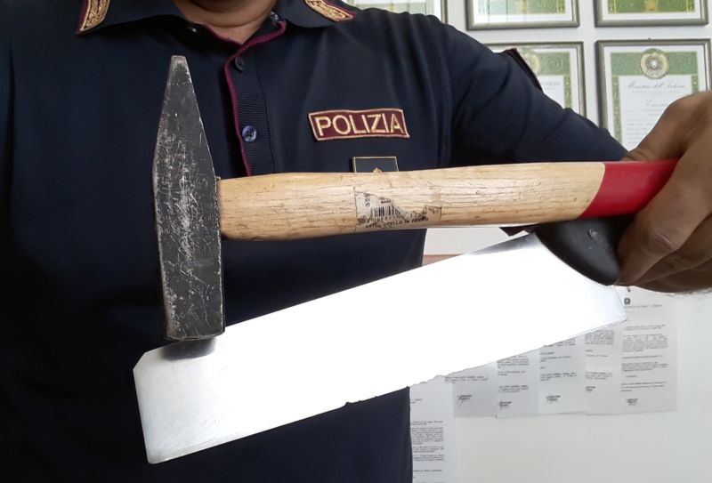 La denuncia è scaturita a seguito di intervento di una pattuglia dell’Ufficio Prevenzione Generale della Questura, effettuato giovedì pomeriggio, a richiesta di alcuni vicini di casa che segnalavano la donna, residente nel loro stesso condominio, che stava dando in escandescenza, minacciando nel cortile chiunque incontrasse, brandendo nelle mani un grosso martello e un coltello da cucina. Gli agenti che sono intervenuti si sono trovati innanzi questa donna dalla corporatura piuttosto robusta, e non è stato facile convincerla ad abbassare quelle armi, che non appena appoggiate al terreno sono state recuperate e sequestrate.