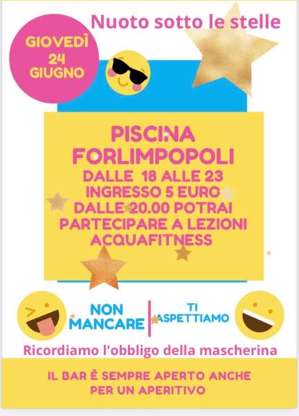 Forlimpopoli, nuoto sotto le stelle e lezioni di acquafitness in piscina Giugno 22, 2021 Giovedì 24 giugno con apertura fino alle 23 presso la piscina di Forlimpopoli serata a tema: “Nuoto sotto le stelle” e “lezioni di acquafitness”…bar sempre aperto.