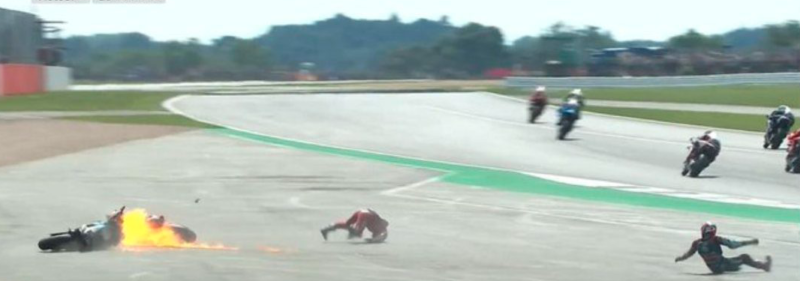 incidente dopo le prime curve del Gran Premio di Gran Bretagna classe MotoGp. La Yamaha di Fabio Quartararo e Andrea Dovizioso si toccano e entrambi i piloti cadono violentemente a terra. La Ducati del forlivese va addirittura in fiamme, mentre Dovizioso, brutta botta per lui, viene portato via in barella al centro medico.