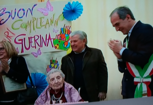 C’erano tante persone alla Casa di Riposo Davide Drudi a Meldola per festeggiare i 112 anni di Guerina Rita Amadei. Oggi 31 gennaio 2018 è il compleanno della nonnina più longeva dell’Emilia Romagna, la quinta più anziana d’Italia. Guerina è stata accolta da un gran calore dal personale della struttura che le vuole un gran bene e che la coccola. Una grande torta con il numero 112. Tanti applausi e lei, seduta in una sedia perché ha difficoltà nelle gambe, ha guardare tutti con quegli occhioni che fanno tantissima tenerezza. Ognuno vorrebbe che campasse tanti altri anni. Il sindaco Gianluca Zattini le ha fatto gli auguri e le ha donato la pergamena del Comune di Meldola. C’era anche il Tg3 regionale che ha mandato in onda il servizio di Giovanna Greco.