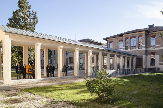 La sequenza di Padiglioni, denominata Sauli-Saffi, è l’elemento più caratterizzante oltre che il perno centrale dell’impianto originario dell’ospedale. Il progetto realizzato ribadisce questo ruolo preminente, facendone il centro dell’intero sistema del Campus e l’incrocio, a tutti i livelli, del “cardo” storico e del “decumano”, ovvero le due arterie primarie di organizzazione dei percorsi universitari. A tal fine, l’intervento comprende anche il restauro del portico che collega il Padiglione d’ingresso con il primo piano del Padiglione centrale. La continuità del percorso è stata garantita inserendo una pensilina di vetro e acciaio a ridosso del Padiglione di ingresso, così come un ponte coperto in vetro e acciaio collega il porticato al primo piano del Padiglione centrale.