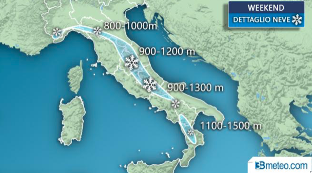 Venerdì i primi refoli freddi giungono sull’Italia dai Balcani con tempo in peggioramento sulle regioni adriatiche e al Sud, specie sullo Ionio. A fine giornata il continuo afflusso di aria fredda potrebbe abbassare il limite delle nevicate fino a 1000/1200m sulla dorsale abruzzese, 1300/1400m su quella calabrese.