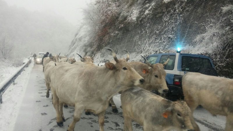 Neve, mucche scortate dalla Polstrada