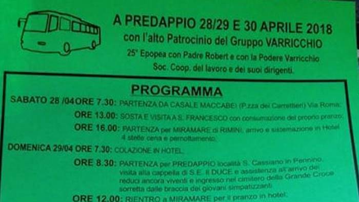Il programma della “gita”, così come si legge sul volantino, prevede la partenza da Casale Maccabei alle 7.30 del mattino del 28 aprile, una sosta e visita a san Francesco ed il conseguente arrivo a Rimini Miramare. Il giorno dopo, ovvero domenica 29 aprile, la visita a Predappio e alla cappella di: “S. E., il Duce ingresso nel cimitero della Grande Croce sorretta dalla braccia dei giovani simpatizzanti”. Il costo della gita è di 200 euro a persona dal volantino è possibile notare come le iscrizioni dovranno avvenire entro il 1 aprile del 2018.