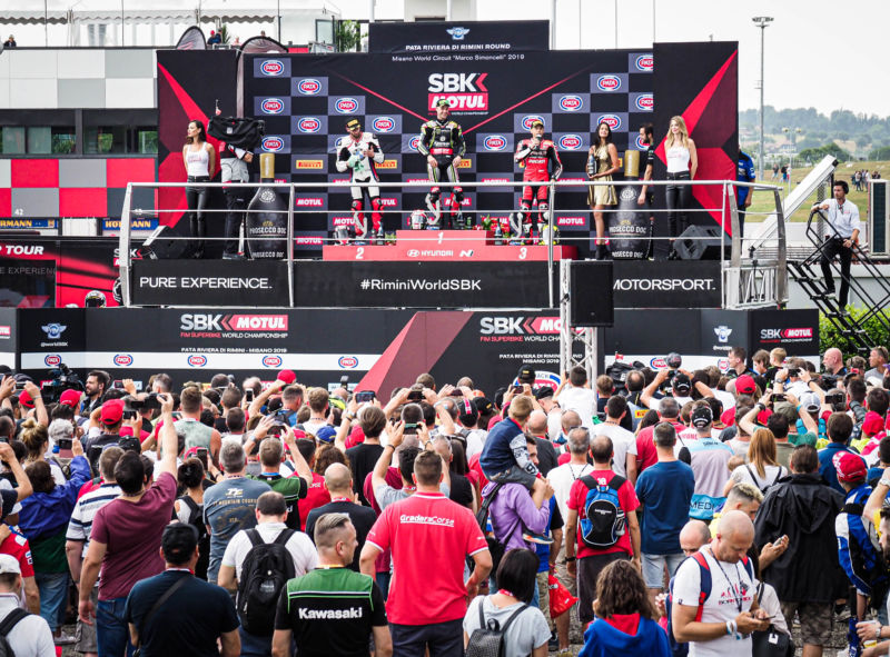 Prima giornata di gare del Pata Riviera di Rimini Round all’insegna della variabilità del meteo e della pioggia martellante, prima e durante Race 1 del WordSBK. Alla fine, acclamato dal folto pubblico in circuito, sul gradino alto del podio ci sale Jonathan Rea, autentico Re di Misano. Il fuoriclasse inglese vince la settima gara al Simoncelli e supera il record di vittorie sulla pista romagnola di Troy Bayliss. Il quattro volte campione del mondo festeggia anche il decimo anniversario dalla sua prima vittoria nel 2009 in Superbike, anch’essa a Misano.