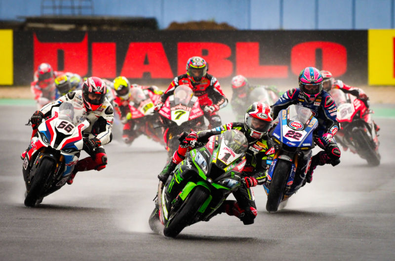 Race 1: al semaforo verde di Race 1 si scatena un nubifragio e durante il giro di ricognizione la direzione di gara decide di esporre bandiera rossa con partenza posticipata secondo la procedura ‘quick restart’. Al semaforo verde Rea si mette in testa, su di lui rinviene Lowes. I due battagliano fra loro, Lowes passa in testa e i due prendono spazio rispetto a Sykes e Bautista che seguono. Al quarto giro altra pioggia improvvisa e fortissima, con bandiera rossa immediata.
