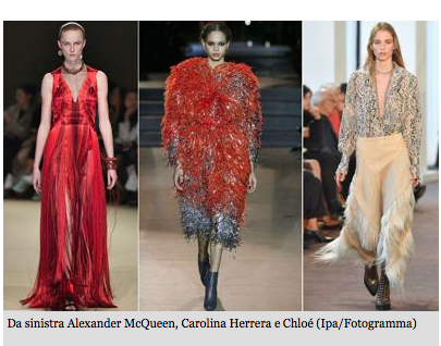 Si infittiscono e si allungano a dismisura, tingendosi di rosso carminio, le frange tratteggiate da Sarah Burton per Alexander McQueen, che avvolgono perfettamente la silhouette, senza stravolgerla o deformarla. Leggere come piume e più discrete, invece, quelle che spuntano sulla pedana di Chloé, dando volume alla figura, senza sgraziarla, grazie all’impronta boho chic tipica della maison parigina. Dominano le paillettes in stille rockabilly, invece, da Tom Ford, che gioca con colori forti, stampe animalier e patchwork multicolor anni ’80 adattandole al tayloring maschile.