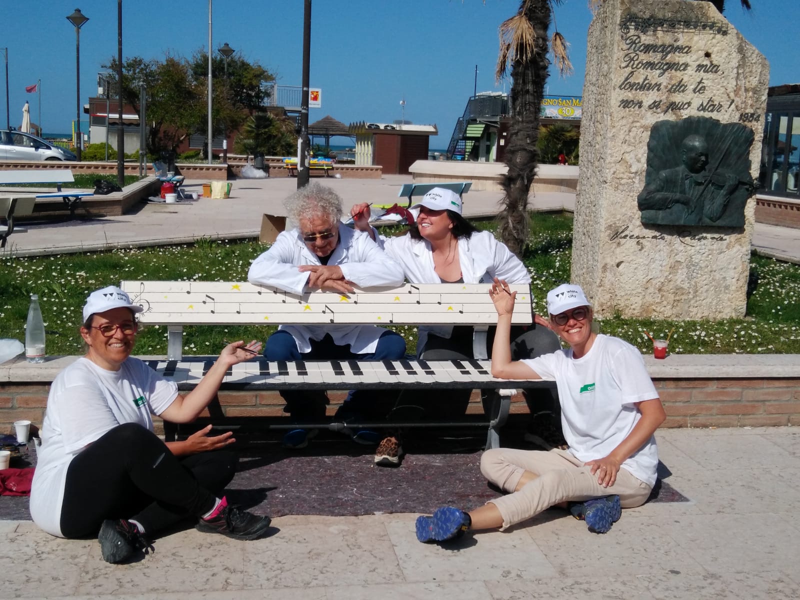 PADRONE DI CASA – Tre ragazze (Emanuela Tonielli, Mara Pellegrino e Monica Montemaggi), un ragazzo (Andrea Borioni) e un mostro sacro della pittura (Romano Buratti): eccolo l’inedito pokerissimo che in queste ore ha ridato nuova vita alle panchine della centralissima Piazza Romagna Mia di Gatteo a Mare. Piazza conosciuta (anche) per il monumento dedicato allo zio di Raul e all’inno ‘nazionale’ di Romagna. Nove le panchine prese di mira da questi fantastici artisti di…strada. Tutte belle, tutte da applausi, le loro creazioni. Anche se, quelle dedicate al ‘padrone di casa’ Secondo Casadei e a Federico Fellini, meritano una menzione particolare.