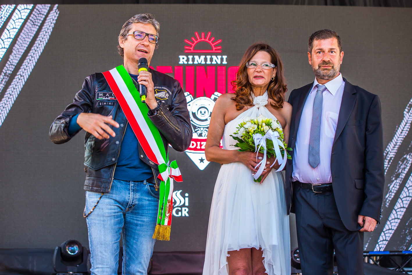 Proprio il Sindaco, con la colonna sonora della marcia nuziale di Wagner rivisitata dai Queen, ha unito in matrimonio Alessandro Conti e Narcisa Hutu. La coppia di Collecchio fu la prima ad arrivare cinque anni fa al debutto di Reunion Rimini e lo scorso anno promise che sul palco di piazzale Fellini si sarebbe unita in matrimonio. Così è stato. “Una scelta che ci inorgoglisce – ha detto il Sindaco Gnassi – e che impreziosisce una manifestazione cresciuta tantissimo. Insieme al gruppo MAC stiamo pensando a sviluppi futuri con una location nella quale si possa anche dormire. Ci stiamo lavorando”.
