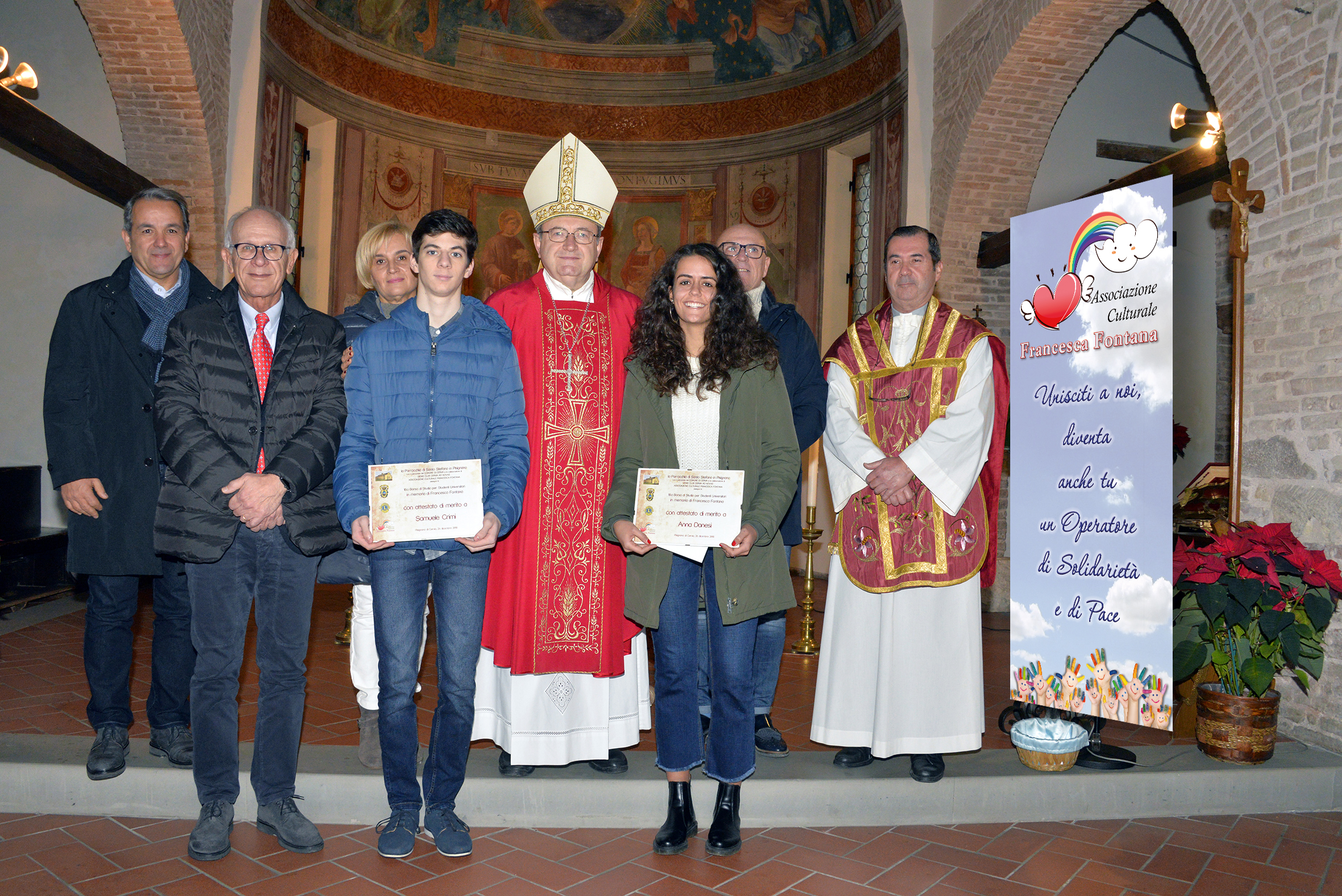 E’ stata consegnata questa mattina in forma solenne, ai giovanissimi studenti universitari cervesi, la 10.a borsa di studio dedicata alla memoria di “Francesca Fontana” – alla quale è anche dedicata l’omonima associazione culturale. L’importante momento al termine della Santa Messa alla Pieve di Santo Stefano a Pisignano, nella giornata del 26 dicembre dedicata al Patrono, alla presenza del vescovo di Ravenna e Cervia Mons. Lorenzo Ghizzoni, dell’assessore alla pubblica istruzione del comune di Cervia Gianni Grandu, della mamma di Francesca che è anche la segretaria dell’associazione Licia Quercioli, del parroco don Lorenzo Lasagni, del presidente del Lions ad Novas Cervia Roberto Sintucci, del presidente dell’associazione culturale Francesca Fontana Paolo Pistocchi e dei Giovanissimi studenti Universitarie Anna Danesi e Samuele Crimi e della presenza di tanti ragazzi già vincitori nel passato della borsa di studio che in occasione del 10.o anno sono stati con noi.
