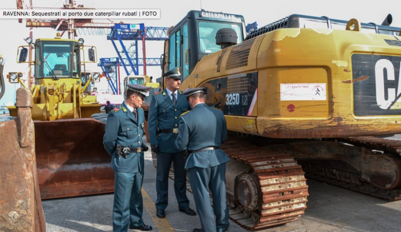 I militari della Guardia di Finanza di Ravenna hanno individuato al porto due escavatori Caterpillar, che erano stati rubati. I due mezzi stavano per essere trasferiti in Medio Oriente e precisamente in Libano.