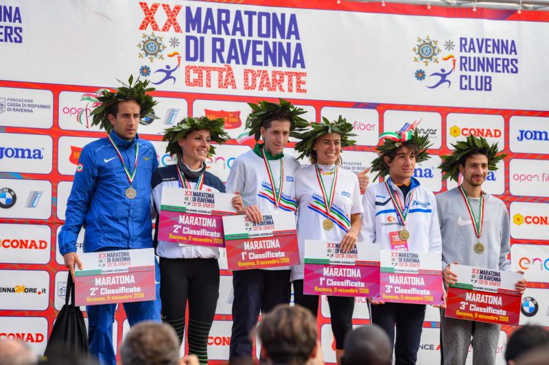 La 20esima edizione della Maratona di Ravenna ha assegnato anche i titoli italiani assoluti di specialità. In campo maschile epilogo incredibile con la vittoria finale per il siciliano Alessio Terrasi (2.19.14”), tesserato per il GP Parco Alpi Apuane, che proprio a pochi metri dal traguardo ha prima recuperato poi superato Francesco Bona (2.19.28”), favorito della corsa ed in testa per tutta la gara prima di crollare a pochi passi dall’arrivo. Terzo posto per Luca Parisi in 2.22.51”. Nuova Campionessa Italiana Femminile di Maratona è invece la romagnola Eleonora Gardelli, tesserata per la Corri Forrest ed originaria di Forlì, che con il tempo di 2.59.19” ha strappato lo scettro in volata alla faentina Elisa Zannoni, la quale ha chiuso al secondo posto in 3.00.07”. Terzo gradino del podio italiano femminile per Linda Pojani in 3.04.35.