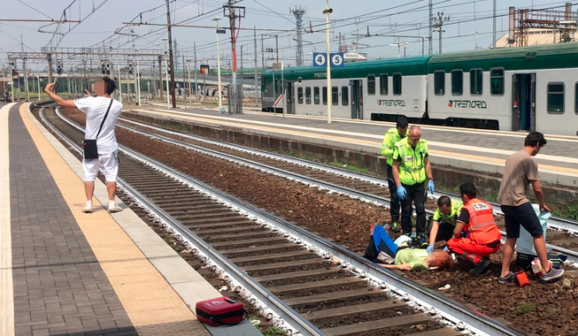 Incredibile: un giovane si fa un selfie con lo sfondo di una donna che stanno soccorrendo sui binari perché urtata da un treno.
