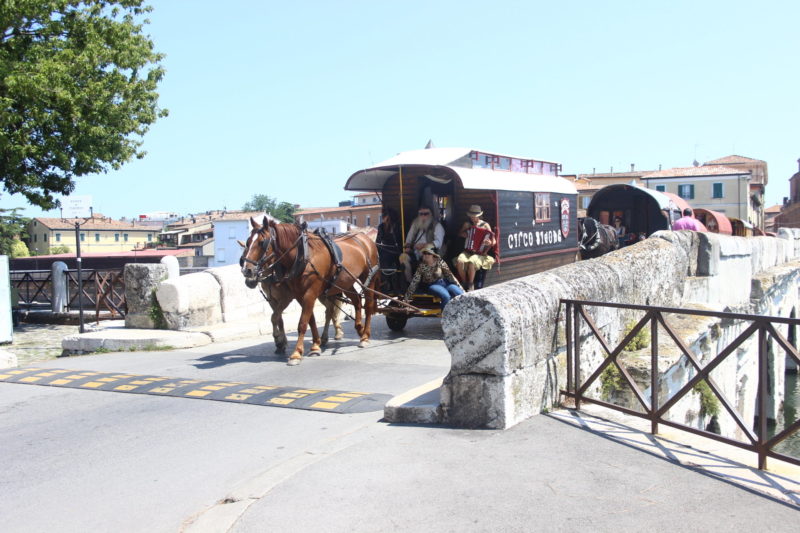 Una carovana di arte, magia e poesia scesa dalla valle al mare. Dopo il debutto a Pennabilli al festival Artisti in piazza, il Cirque Bidon è arivato a Rimini: da domani, martedì 19 giugno fino al 1° luglio, uno dei più importanti ‘circhi visionari’ al mondo presenterà al pubblico il nuovo spettacolo Entrez dans la danse! una produzione ATER – Associazione Teatrale Emilia Romagna, con il Festival Tutti Matti per Colorno e Teatro Necessario. La carovana di cavalli e carrozze è partita ieri da Pennabilli ed è arrivata nel primo pomeriggio di oggi, fermandosi alla piazza sull’Acqua del ponte di Tiberio, dove sarà allestito lo spettacolo (tutte le sere ore 21.30). I biglietti sono disponibili in prevendita su Vivaticket.it.