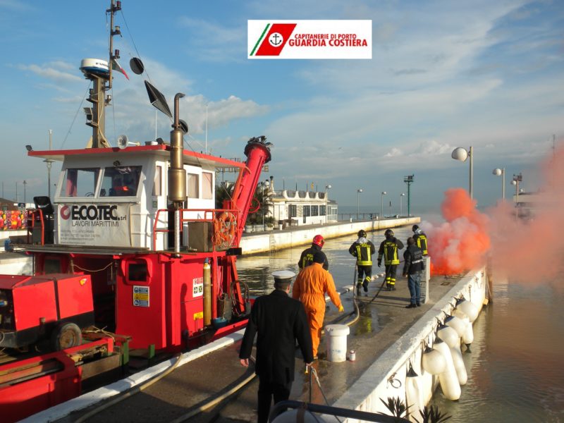 Esercitazione antincendio dell’Ufficio Locale Marittimo di Riccione, a bordo della Moto Draga “Uso”, ormeggiata nella “Darsena di Levante” del Porto di Riccione.