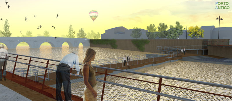 L’idea progettuale della realizzazione di una passerella galleggiante di collegamento pedonale e con bici a mano delle due banchine; di un percorso pedonale e con bici a mano, per procedere in sicurezza sulla Via Bastioni Settentrionali e di un percorso privo di barriere architettoniche per raggiungere il piano delle banchine e godere dello spettacolo mozzafiato del Ponte di Tiberio visto a pelo d’acqua, si inserisce all’interno di un piano generale di valorizzazione delle risorse storico-culturali e l’implementazione della connessioni delle reti ciclopedonali, in particolare attraverso il circuito ciclabile de “l’Anello Verde”.