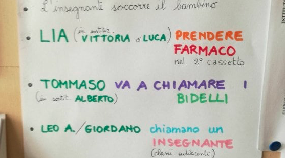 Lia, Vittorio e Luca hanno il compito di prendere un farmaco dal cassetto; Tommaso e Alberto vanno a chiamare i bidelli; Leo e Giordano vanno a chiedere aiuto a un altro insegnante di una classe vicina; Giulia prende il cuscino, Gaia e Josef danno il cellulare alla maestra e infine Diana sta vicina all’insegnante per qualsiasi evenienza.