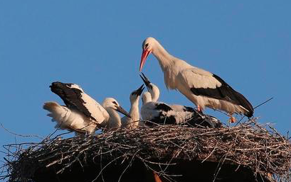 Ormai di casa al Parco tematico Oltremare di Riccione, papà Hula e mamma Hoop, esemplari di cicogna bianca (Ciconia ciconia), hanno fatto un nuovo nido e, stavolta, sono nati cinque piccoli.