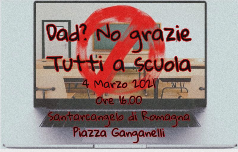 Giovedì 4 Marzo 2021 in piazza Ganganelli a Santarcangelo di Romagna un folto gruppo di genitori ed insegnanti prenderà parte alla manifestazione organizzata da Sabrina Saccomanni, imprenditrice e mamma di due bambini frequentanti le scuole elementari. ” Ho pensato – dichiara Sabrina Saccomanni – che fosse importante far sentire la voce di genitori ed insegnanti che si trovano ad affrontare le enormi difficoltà della didattica a distanza. È complesso per molte famiglie conciliare impegni di lavoro con l’assistere i propri figli nelle mattinate di DAD. Alla luce dei mesi passati molti lavoratori dipendenti hanno finito congedi e ferie ed i genitori che sono liberi professionisti devono rinunciare alle loro attività per aiutare i propri figli nelle lezioni. Va sottolineato che non tutte le famiglie hanno dotazioni tecnologiche a sufficienza e purtroppo molto spesso le stesse Istituzioni faticano a sopperire a questo deficit “. La manifestazione si terrà nel rispetto del distanziamento e nel massimo rispetto delle normative anti Covid.