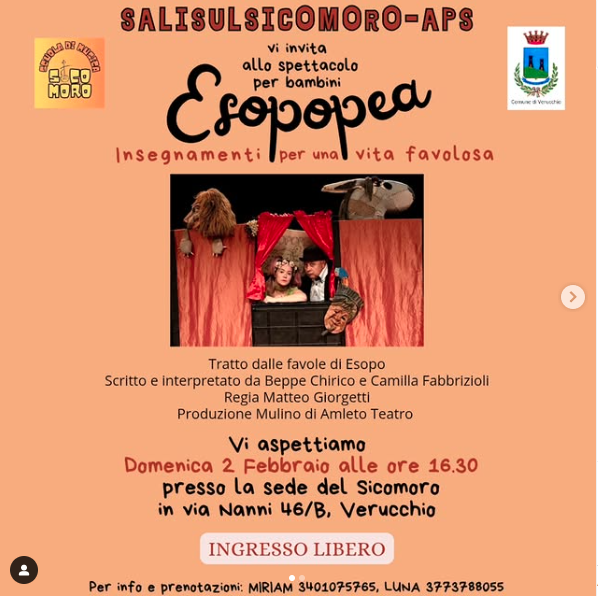 Domenica 2 Febbraio alle ore 16.30 šš©ššššššØš„šØ š©šš« ššš¦šš¢š§š¢ ESOPOPEA, insegnamenti per una vita favolosa!Ā Uno spettacolo tratto dalle favole di Esopo che si svolgerĆ nella sede del Sicomoro inĀ Via Nanni 46/b a Verucchio. Interpretato da Beppe Chirico e Camilla Fabbrizioli. Regia di Matteo Giorgetti. Produzione Mulino di Amleto.