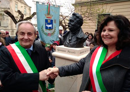 L’opera, collocata in via Emanuele Duni, a pochi metri dai rioni Sassi e dallo storico edificio che oggi ospita il Museo di arte medievale e moderna, è stata inaugurata da Raffaello De Ruggieri, sindaco di Matera, e da Luciana Garbuglia, primo cittadino di San Mauro Pascoli, il paese natio del poeta. Il monumento è un busto in bronzo, realizzato dall’artista materano Francesco Pentasuglia, che poggia su un pilastro in marmo sul quale sono stati scolpiti versi di celebri poesie o scritti che ricordano Matera. (Foto Ansa)