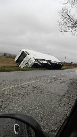 Ha ceduto un pezzo di asfalto, probabilmente la banchina e il grosso mezzo è finito nel canaletto fiancheggiante con le ruote in aria.