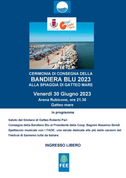 Venerdì 30 Giugno alle ore 21.30 all’Arena Rubicone di Gatteo Mare si terrà la Cerimonia di consegna della bandiera Blu.