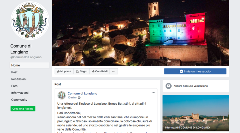 La pagina, all’indirizzo www.facebook.com/ComuneDiLongiano, è dedicata ai servizi e alle attività del Comune, e sarà uno strumento utile all’Amministrazione comunale per informare i cittadini e naturalmente per raccogliere da questi commenti, richieste, domande, critiche e suggerimenti: una funzione importante, specie in giorni di emergenza sanitaria come quelli che stiamo vivendo. In questo modo, l’Amministrazione comunale di Longiano mette a disposizione dei cittadini un nuovo e ulteriore canale istituzionale di informazione, che va ad affiancarsi al sito web ufficiale del Comune (www.comune.longiano.fc.it) e alla pagina Facebook dell’Ufficio Turistico, che è peraltro già attiva da diversi anni, e che anche in questi drammatici giorni ha continuato la sua attività principale ma ha anche condiviso le informazioni più importanti in materia di emergenza covid-19 (www.facebook.com/ufficioturisticolongiano.pagina).