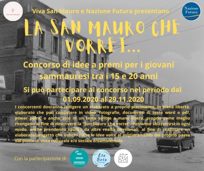 Nazione Futura e Associazione Viva San Mauro di San Mauro Pascoli hanno organizzato il suo primo evento, il Concorso di idee a premi la “San Mauro che vorrei” rivolto a tutti i giovani Sammauresi di età compresa tra i 15 e i 20 anni. Il concorso valido dal 1 settembre 2020 al 29 novembre 2020 e’ stato lanciato sul web proprio oggi 31 Agosto 2020 tramite la pagina Facebook dell”Associazione.