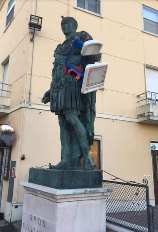 Sbeffeggiata nuovamente la statua di Giulio Cesare a Savignano sul Rubicone. Non importa se la storia ha decretato che egli sia stato – ed è – uno dei maggiori personaggi. Non importa se Savignano ha lustro come cittadina proprio e grazie a colui che varcò il Rubicone. Nulla: la goliardata – se di questo si tratta – questa mattina era proprio lì, in bella mostra, all’entrata della città. Alcuni mesi fa è accaduta la stessa cosa, nonostante l’amministrazione avesse negato il fatto.