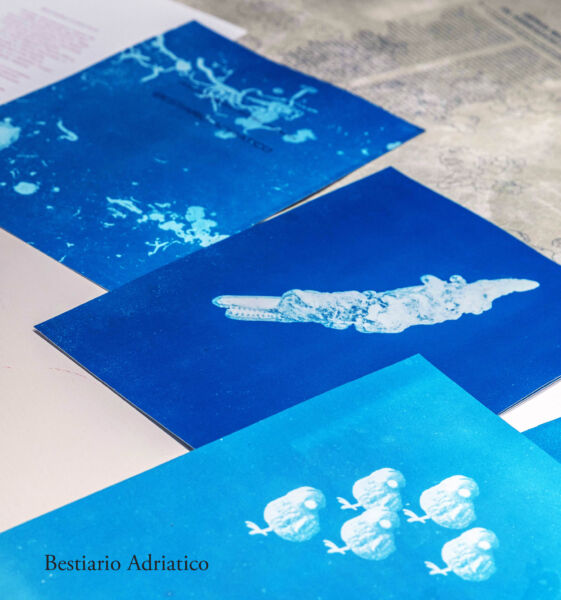L’opera finalista, Bestiario adriatico è un campionario di vecchi giocattoli oramai sfiniti e frammentati, ritrovati sulla battigia dopo le mareggiate invernali, reinterpretati con le tecniche della cianotipia, una sorta di fotografia rudimentale, e della calcografia. Un progetto che ha avuto una lunga gestazione, nato dall’incontro fra Gabriele Geminiani, “collezionista” di cose ritrovate nonché iniziatore del San Marino Green Festival, con la giovane artista Veronica Azzinari, che vanta una personale investigazione del mondo vegetale, colto da prospettive insolite e rappresentato utilizzando le tecniche incisorie classiche, come la calcografia.