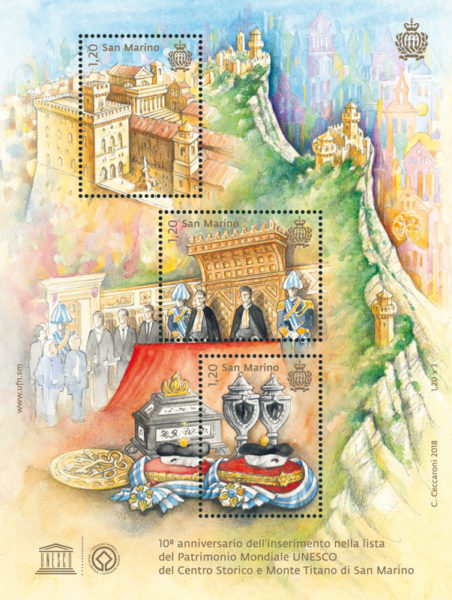 L’Ufficio Filatelico e Numismatico trasmette le informazioni relative al programma filatelico previsto per l’anno 2018: Cod. 664: 10° anniversario dell’inserimento nella lista del Patrimonio Mondiale UNESCO del Centro Storico e Monte Titano di San Marino.