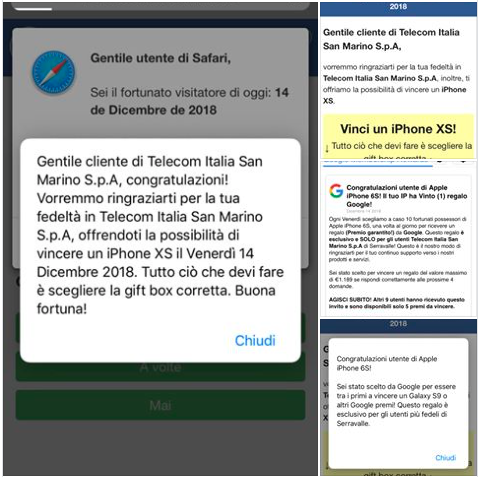 Se durante la navigazione su Internet utilizzando telefoni cellulari, all’apertura di una pagina qualsiasi vi compare uno di questi messaggi, fate attenzione!. Sono naturalmente truffe online che utilizzano il sistema chiamato SCAM, dove una volta rintracciato il vostro indirizzo IP, riportano la compagnia telefonica a voi in uso, il quale vi “regala “ un nuovo telefono se rispondete a semplici domande o indovinate la casella giusta. Una volta vinto, naturalmente vi chiedono i vostri dati e li scatta la truffa, (SCAMMING), perché vi ritroverete abbonati a siti o riviste con costi mensili anche di 50,00 Euro, difficili da disattivare.