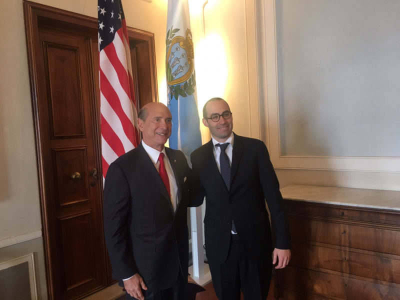 E’ salito oggi sul Titano SE Lewis M. Eisenberg, per consegnare alla Reggenza le Lettere che lo accreditano quale Ambasciatore Straordinario e Plenipotenziario degli Stati Uniti d’America presso San Marino.